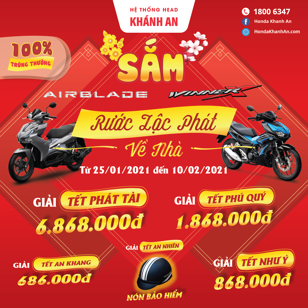 Từ ngày 25/01/2021 đến 10/02/2021, khi đến mua xe WINNER X hoặc AIRBLADE tại các cửa hàng thuộc Hệ Thống Honda Khánh An, bạn sẽ được tham gia chương trình quay số trúng thưởng với tỷ lệ trúng lên đến 100% và rinh về nhiều Voucher hấp dẫn, cụ thể như sau: